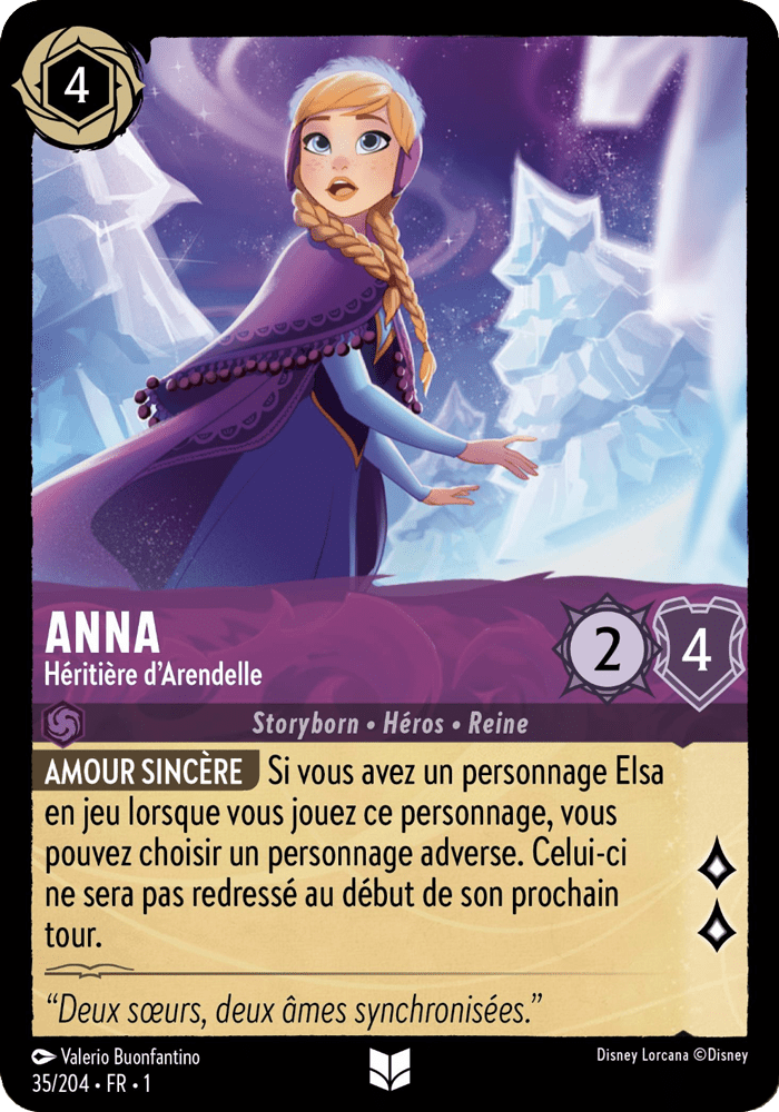 Carte à collectionner Disney Lorcana Anna - Héritière d'Arendelle numéro 35 (Peu commune) en français, en très bon état (protégée par une sleeve après sortie de booster).