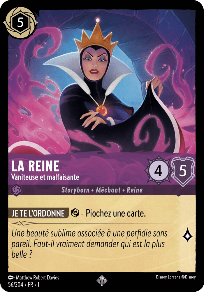 Carte à collectionner Disney Lorcana La Reine - Vaniteuse et malfaisante numéro 56 (Super Rare) en français, en très bon état (protégée par une sleeve après sortie de booster).